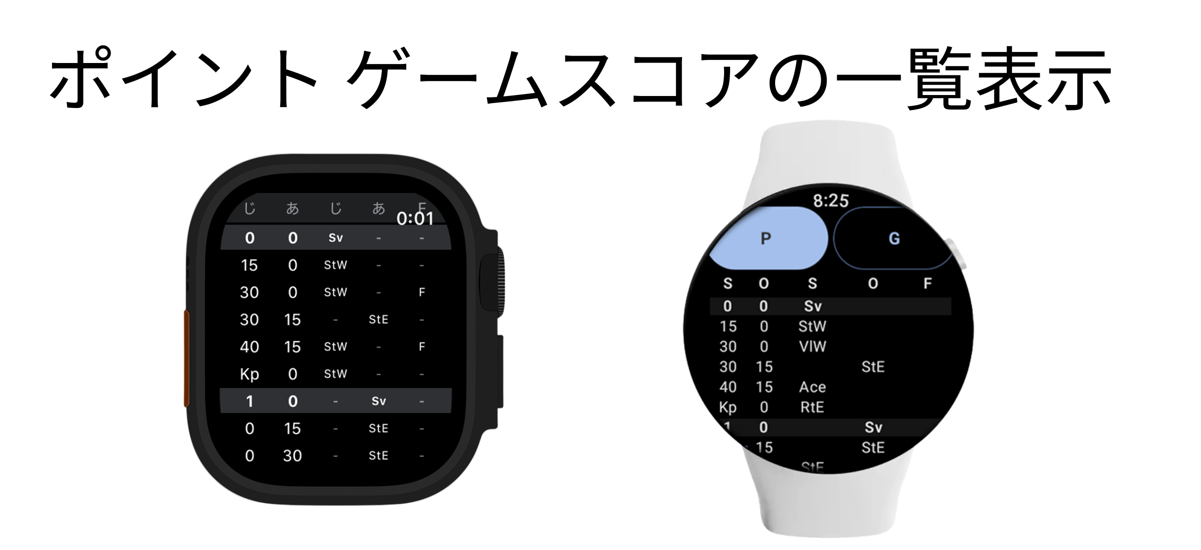 現在のスコアをウォッチ画面で確認できます。ポイントの履歴や、ゲームカウントが一目でわかり、試合の状況を常に把握できます。