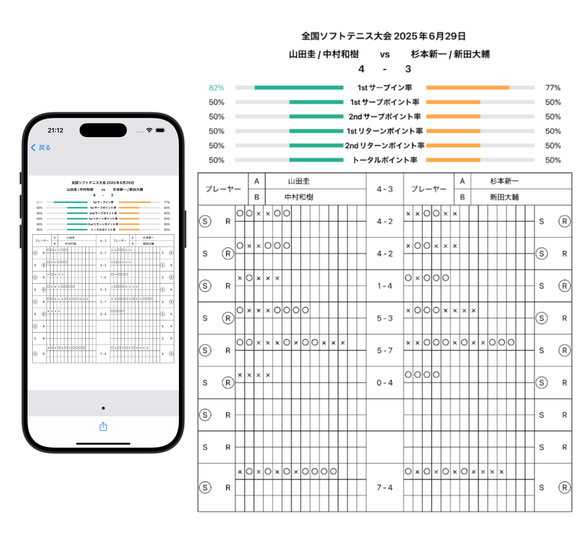 スコアシート出力機能では、ソフトテニス専用のジャッジペーパー形式で試合のスコアをレポート出力できます。公式戦や大会で使用するジャッジペーパーと同じ形式で出力できるため、試合の記録を正式な形で残せます。