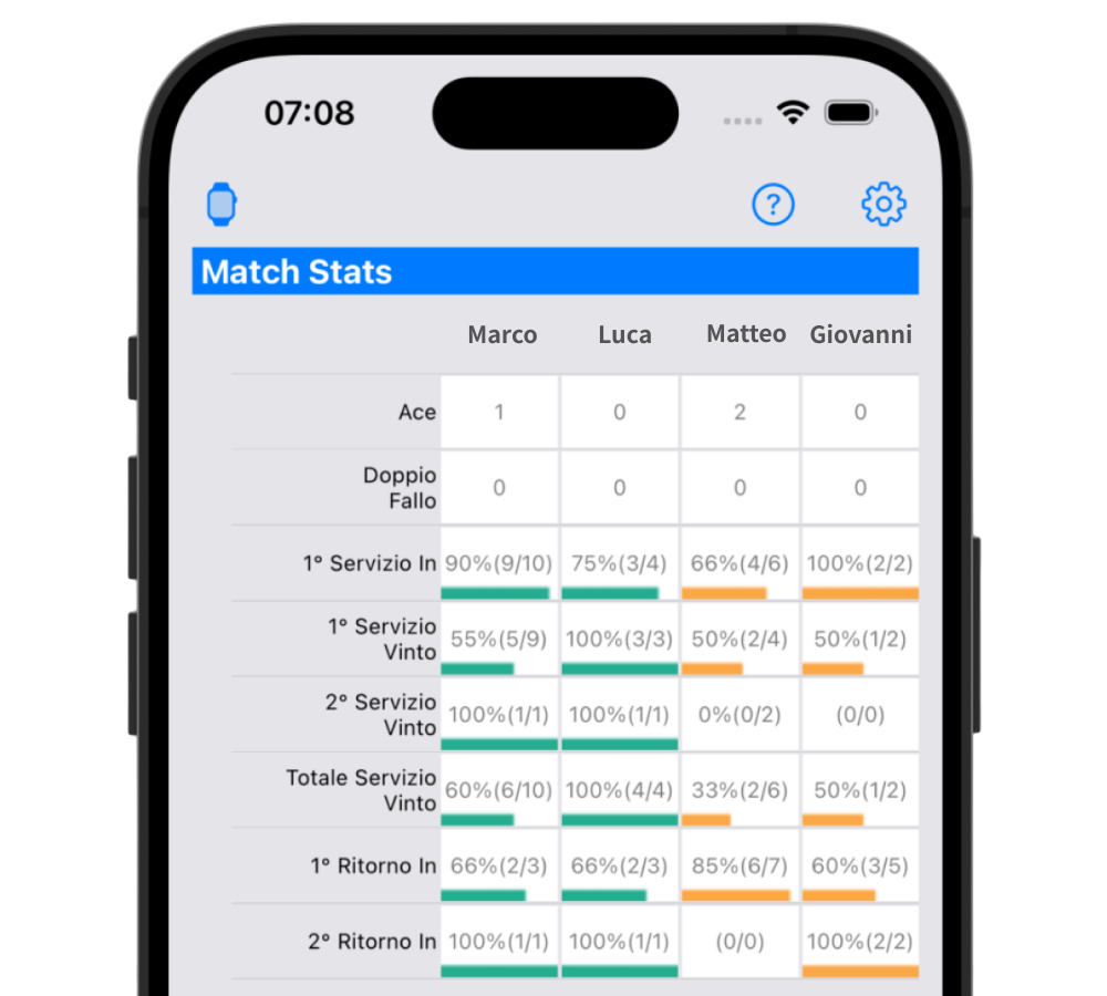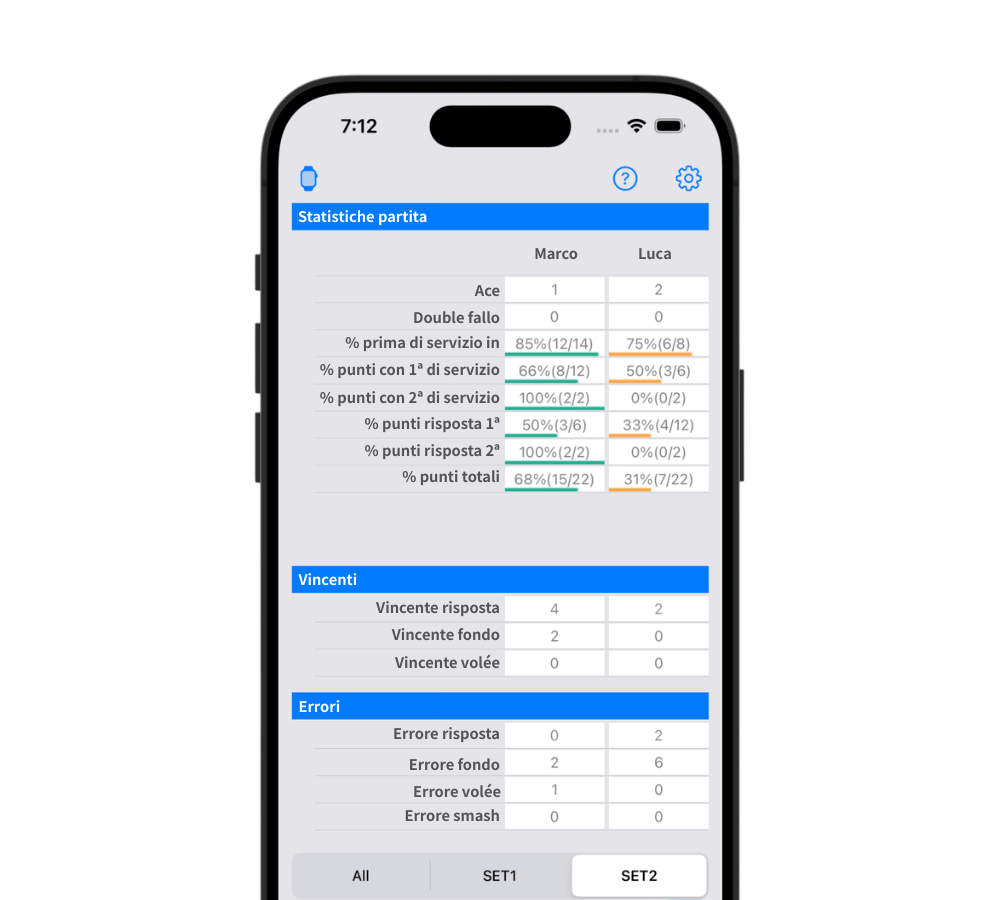 Mostra le percentuali di punti vinti e di primi servizi, molto utile per il mio allenamento. Poter tenere un punteggio di livello professionale rende le partite più piacevoli.