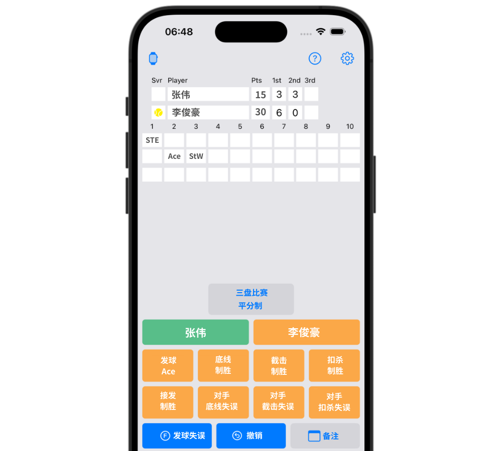 可以。应用提供仅记录比分的简单模式。除此之外,还有可以记录 Ace、制胜分等击球内容的普通模式,记录正手/反手的模式,以及记录受迫性失误与非受迫性失误的错误模式。